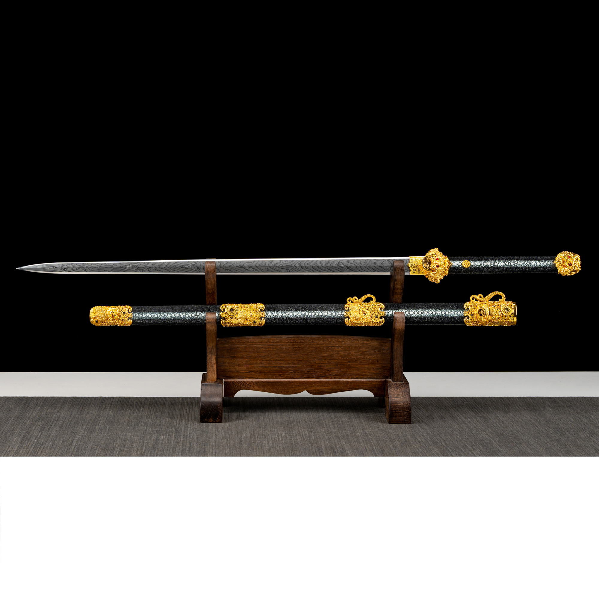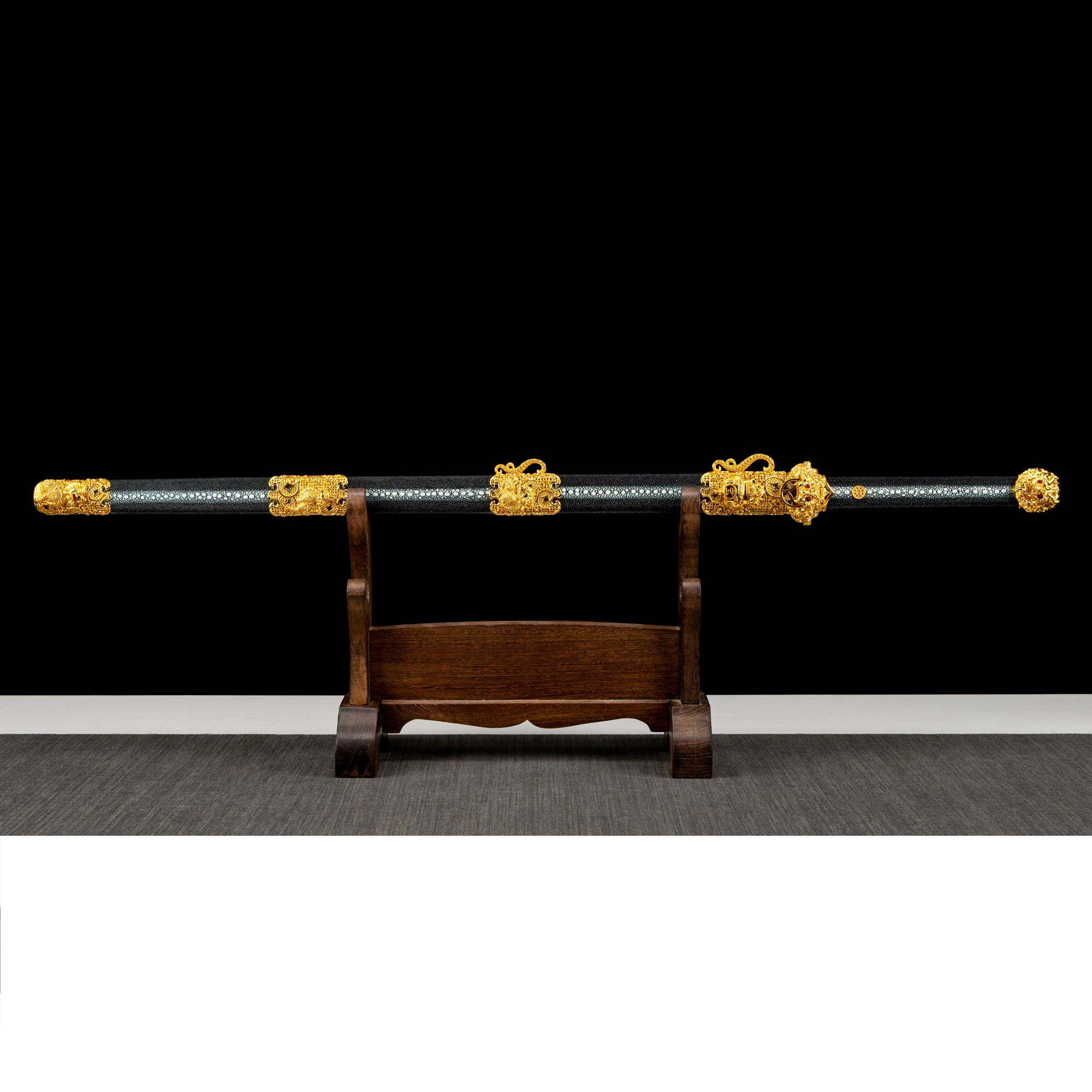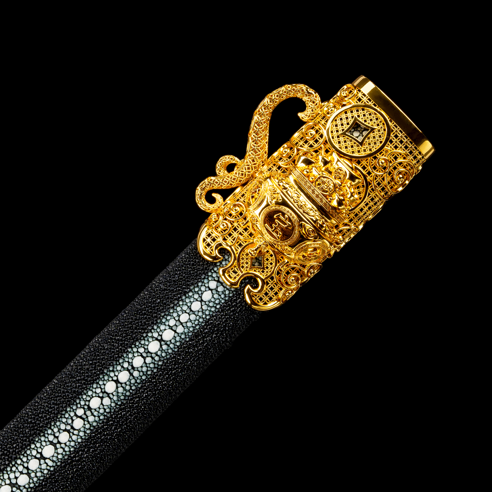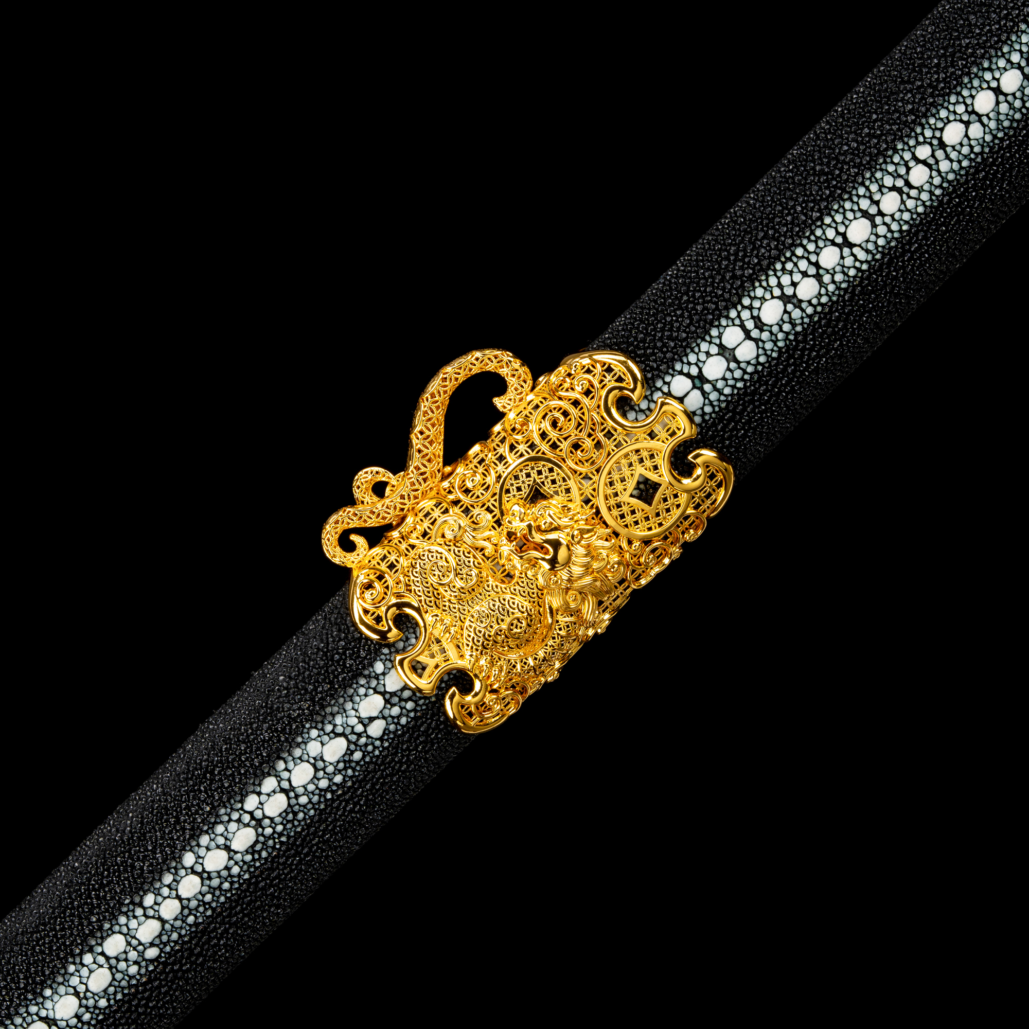 Scabbard: Black sharkskin inlaid with rows of white mother-of-pearl beads (finished in black lacquer) | Fittings: Gilded brass with cloisonné enamel inlay | Blade: Hand-forged meteorite iron featuring a “Mountain and Water” pattern, with a polished white cutting edge | Overall Length: 109 cm | Hilt Length: 30 cm | Total Weight: 1.65 kg | Weight (excluding scabbard): 1.1 kg