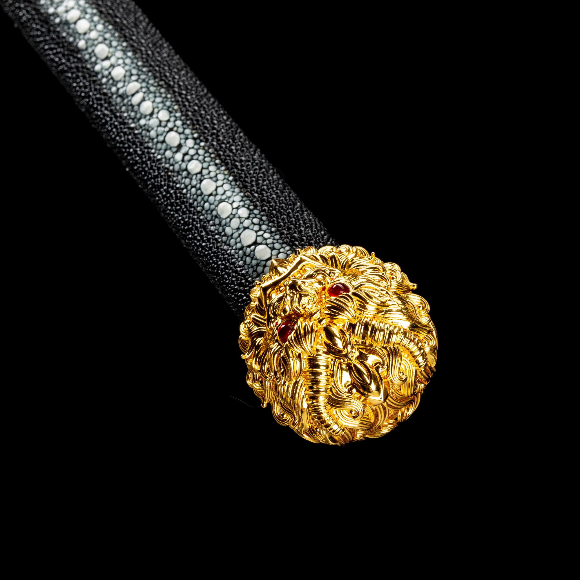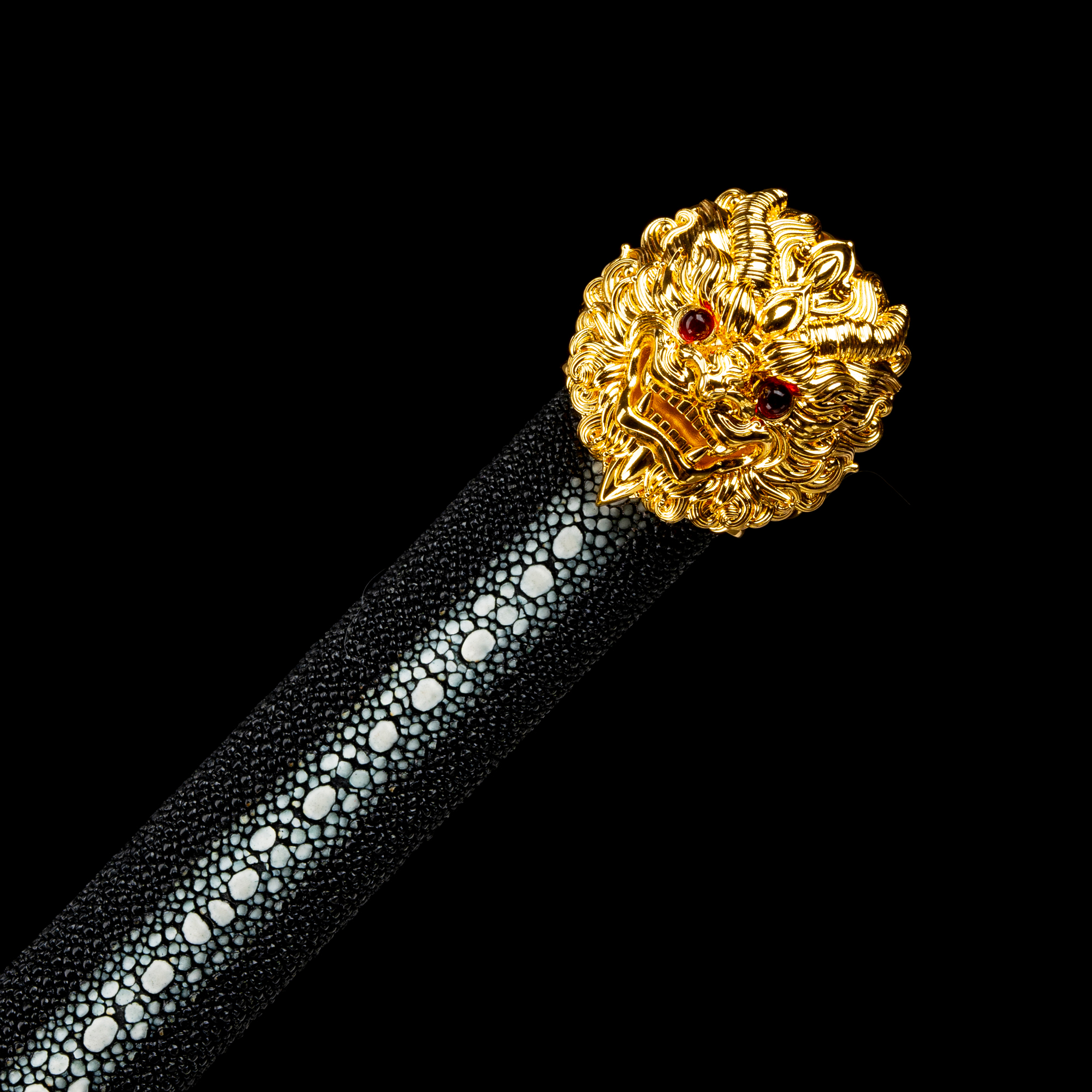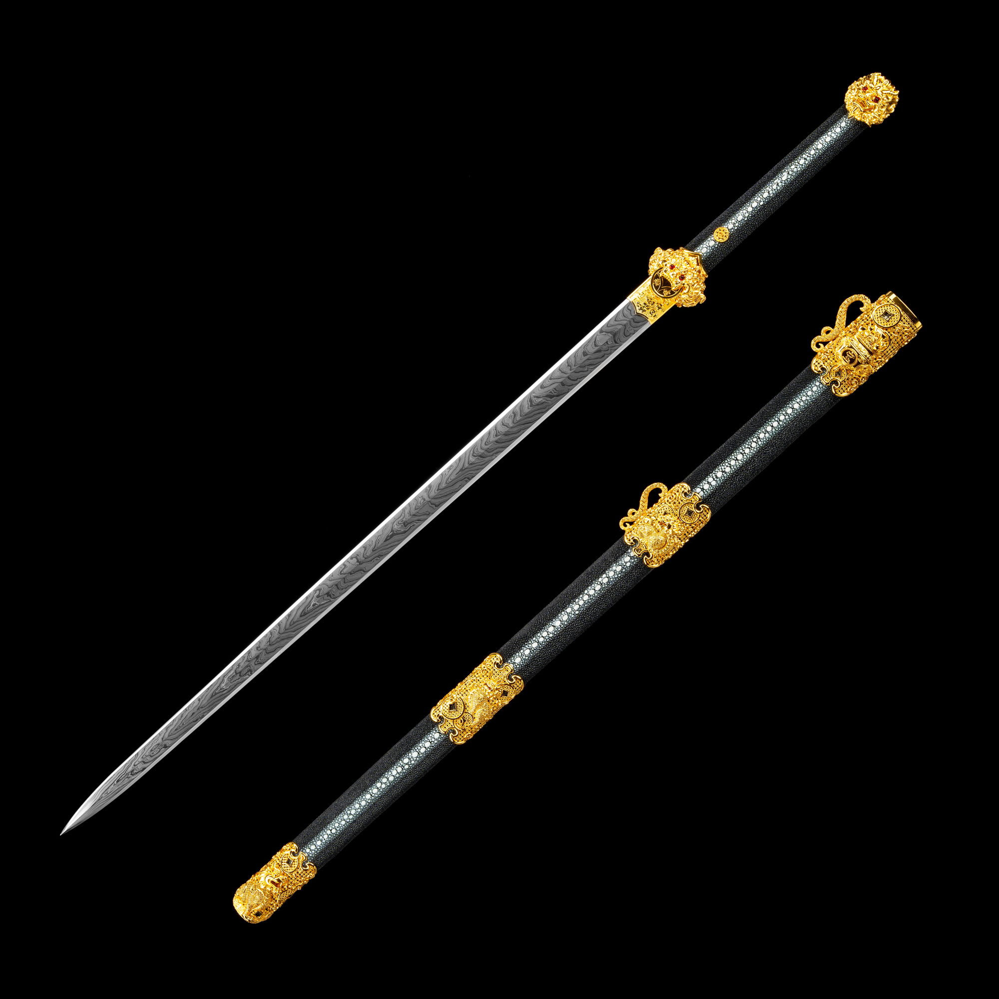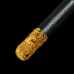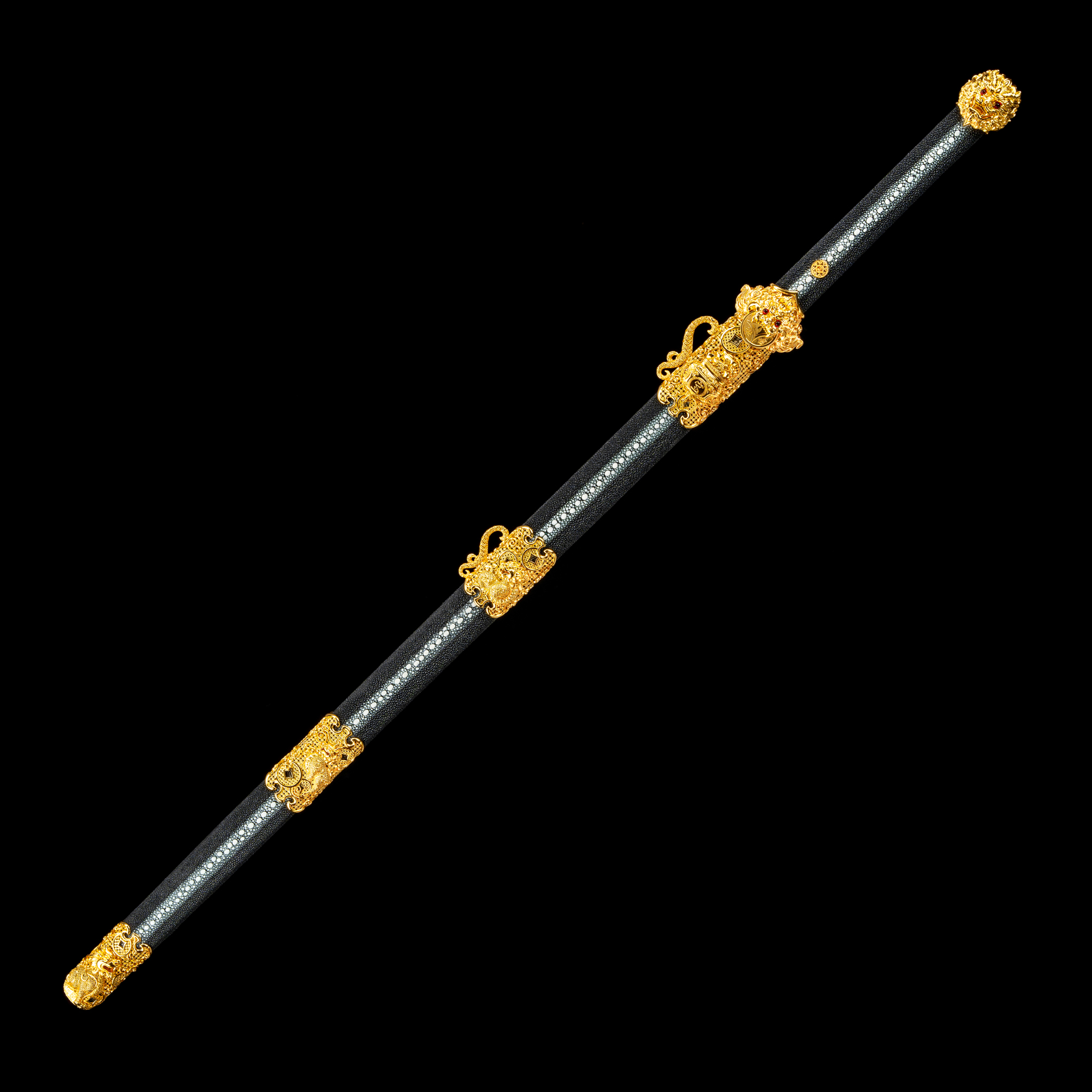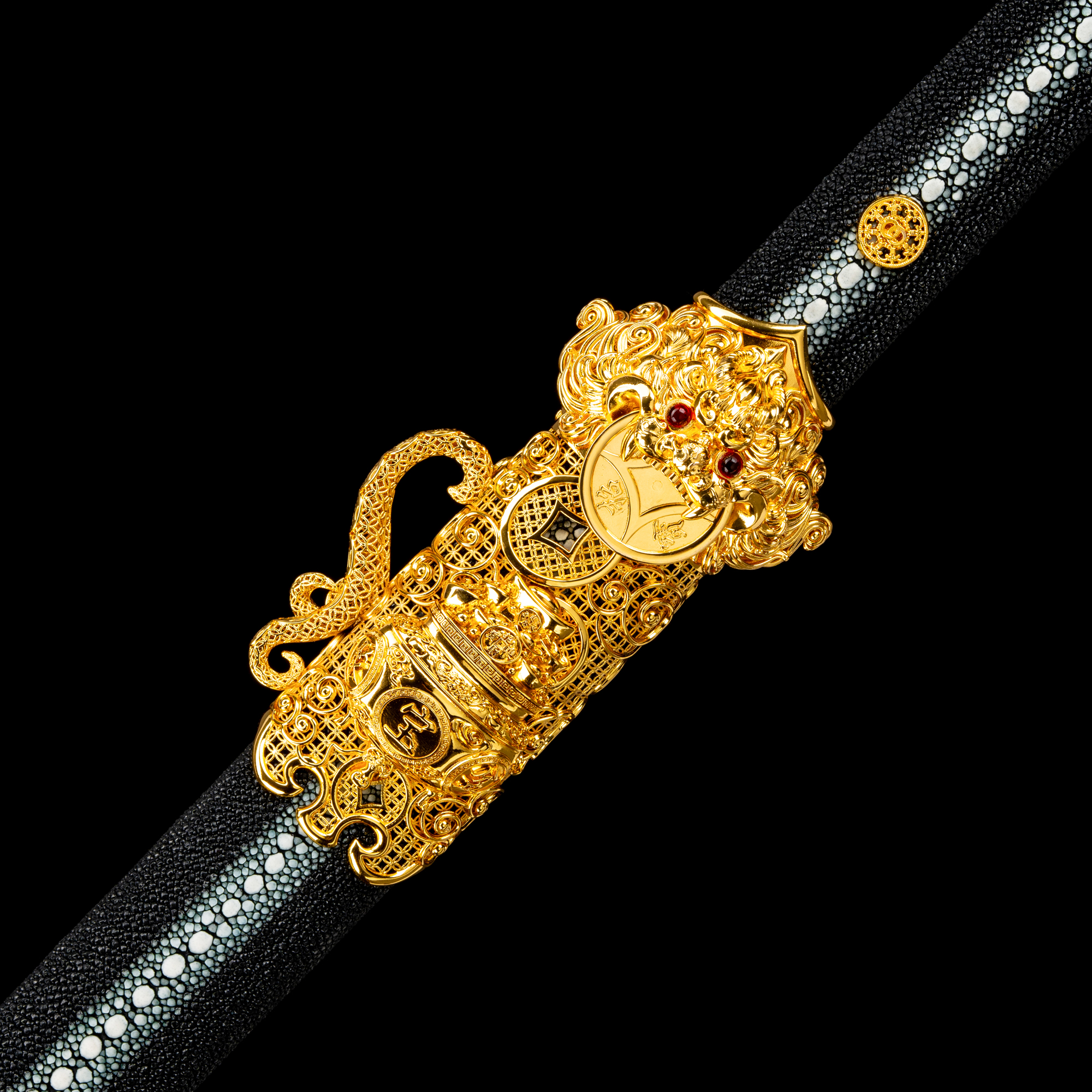 Scabbard: Black sharkskin inlaid with rows of white mother-of-pearl beads (finished in black lacquer) | Fittings: Gilded brass with cloisonné enamel inlay | Blade: Hand-forged meteorite iron featuring a “Mountain and Water” pattern, with a polished white cutting edge | Overall Length: 109 cm | Hilt Length: 30 cm | Total Weight: 1.65 kg | Weight (excluding scabbard): 1.1 kg