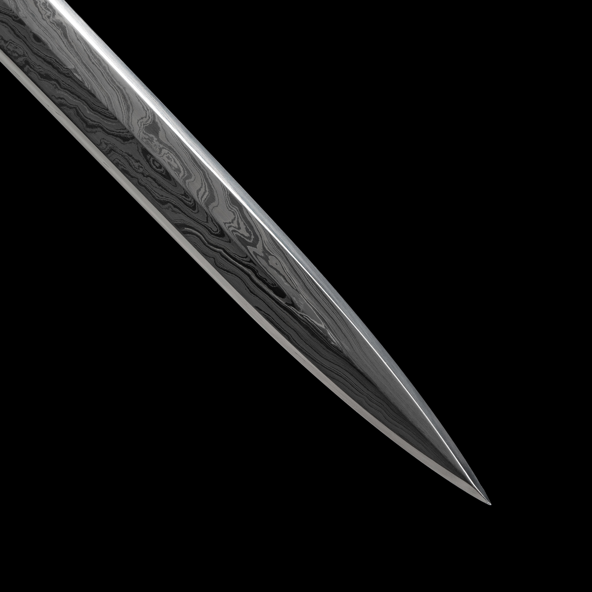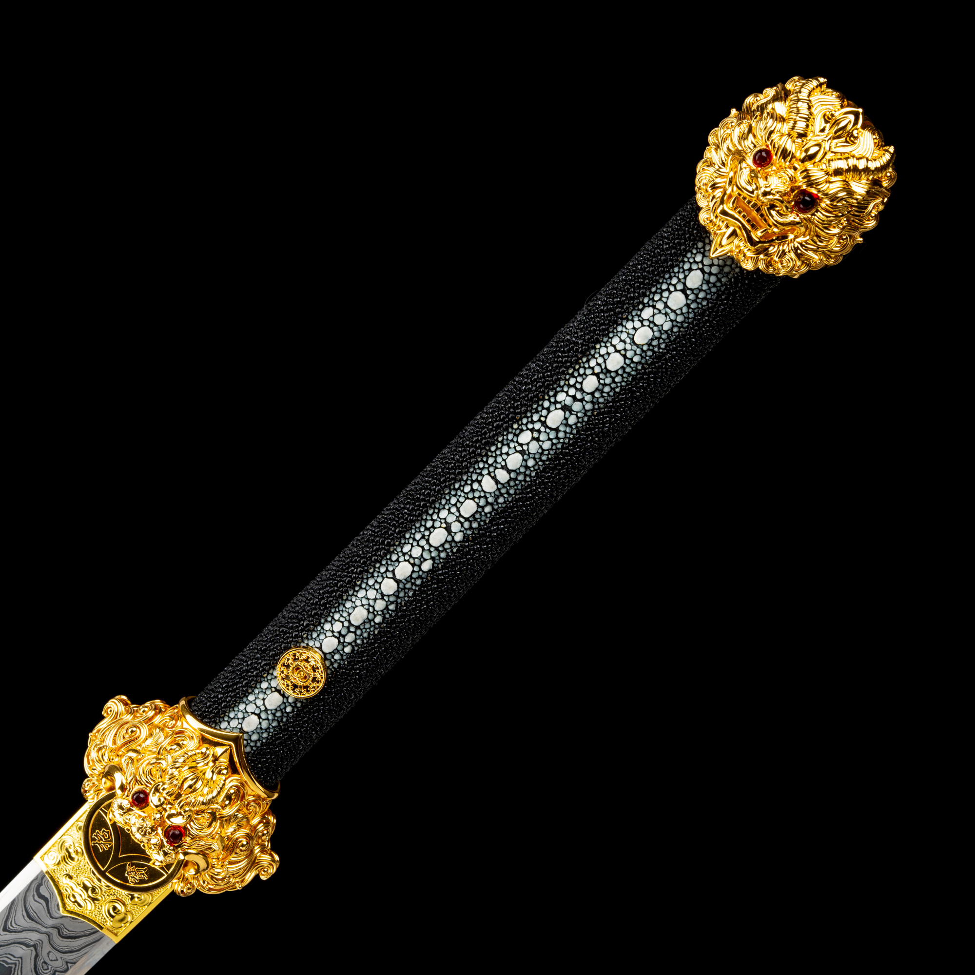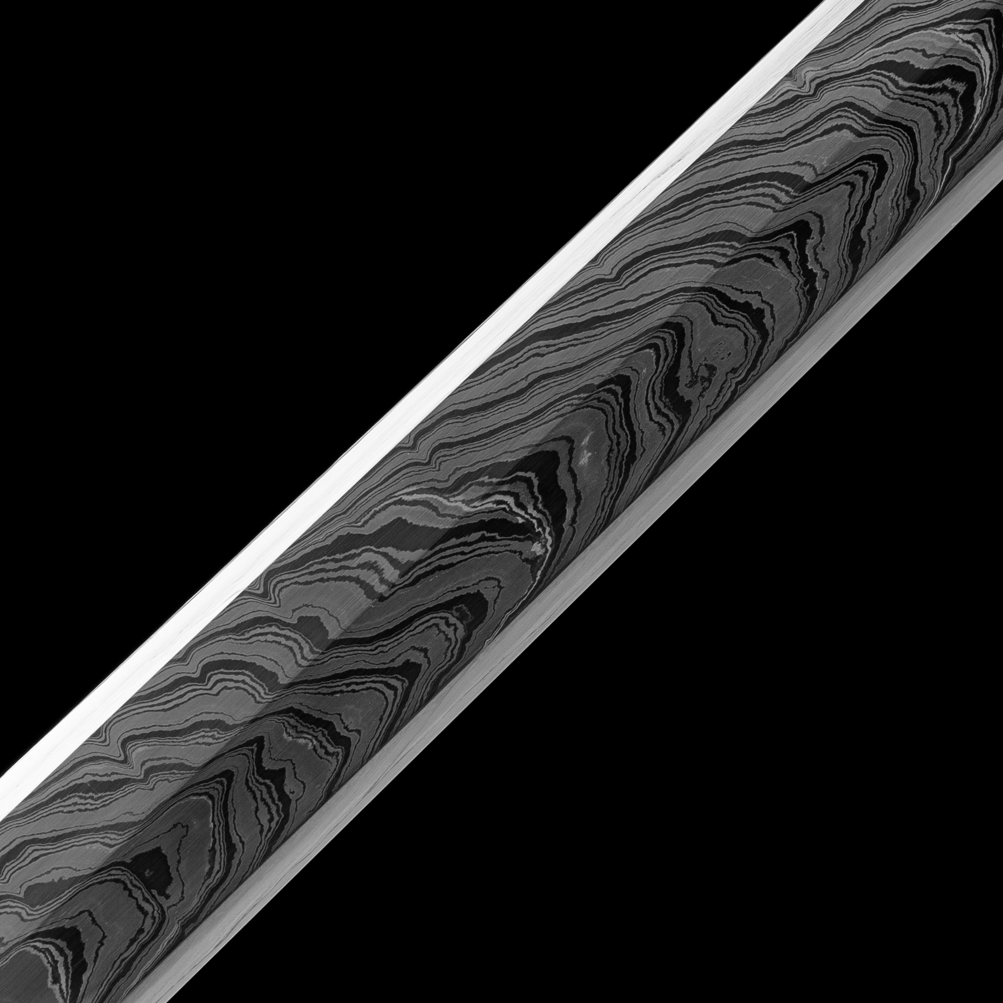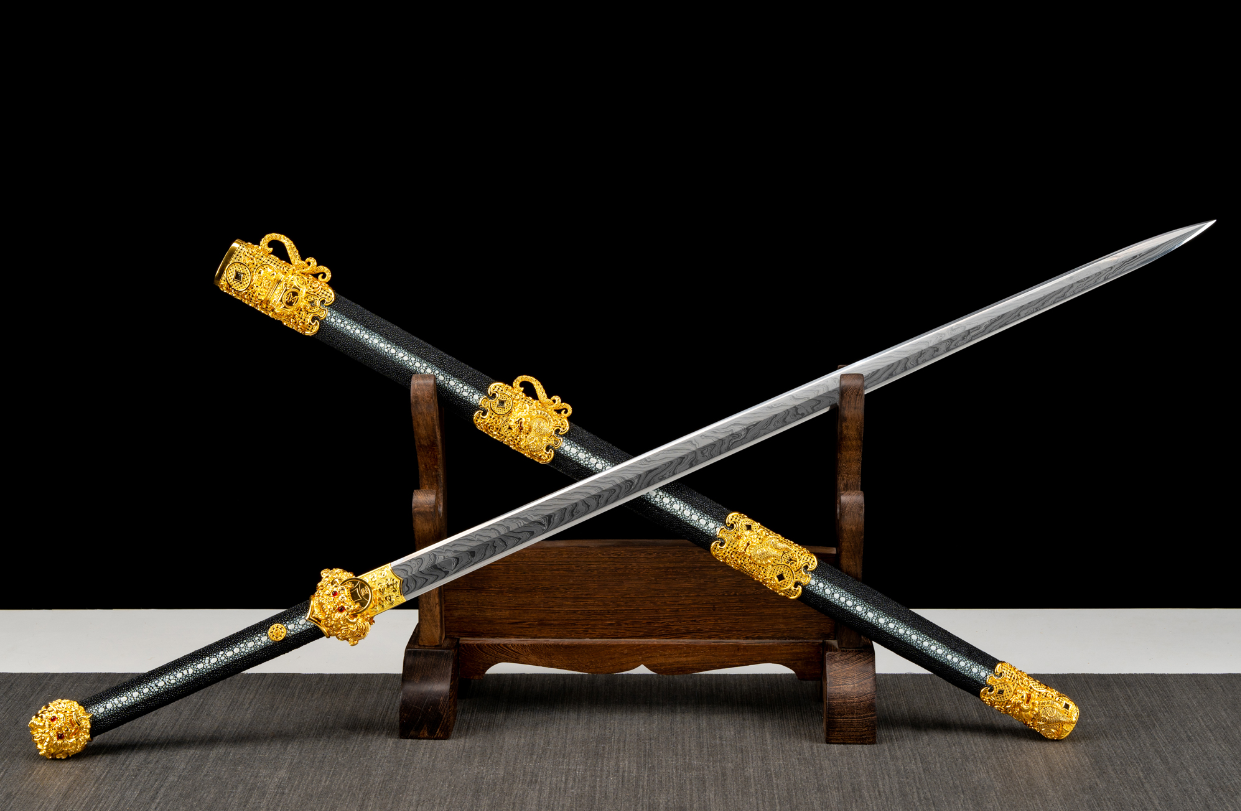 Scabbard: Black sharkskin inlaid with rows of white mother-of-pearl beads (finished in black lacquer) | Fittings: Gilded brass with cloisonné enamel inlay | Blade: Hand-forged meteorite iron featuring a “Mountain and Water” pattern, with a polished white cutting edge | Overall Length: 109 cm | Hilt Length: 30 cm | Total Weight: 1.65 kg | Weight (excluding scabbard): 1.1 kg